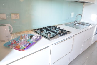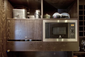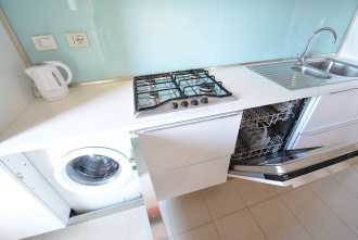 - stylish living room (open space, sunny and large): 2 windows, a sofa, 2 armchairs, blanket box, iPod docking station, flat-screen TV, DVD player Blu Ray player, table and chairs - cooking area: stove-top, kitchen sink, electric oven, dishwasher, refrigerator with freezer, coffee moke, dishes, glasses, cups, bowls, pots
