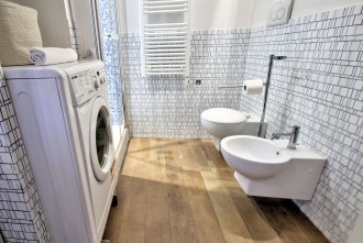 - bagno: una finestra, doccia, lavabo con specchio, bidet, WC, asciugacappelli, lavatrice, boiler elettrico